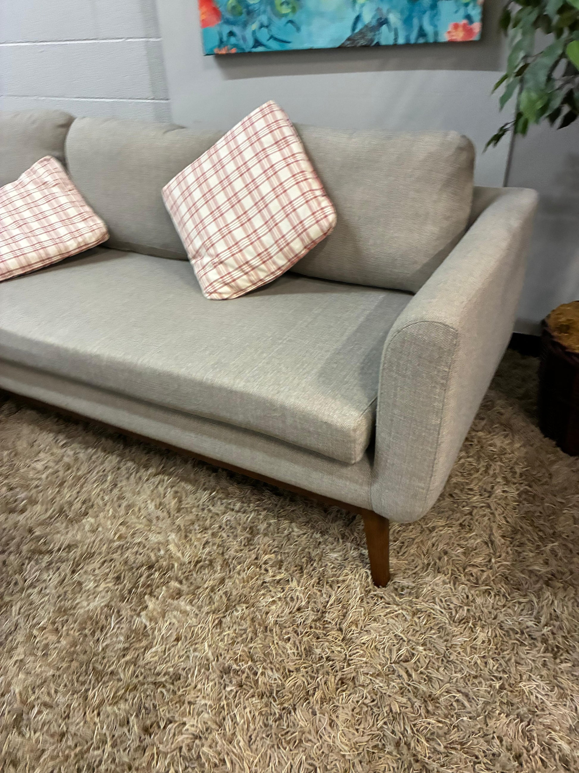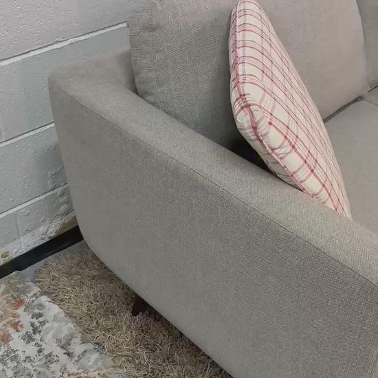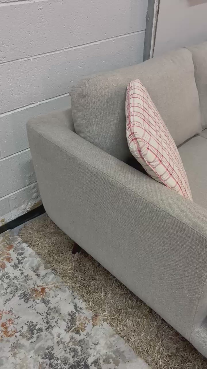 Upholstered in Venga 004 Mole (light gray woven fabric).