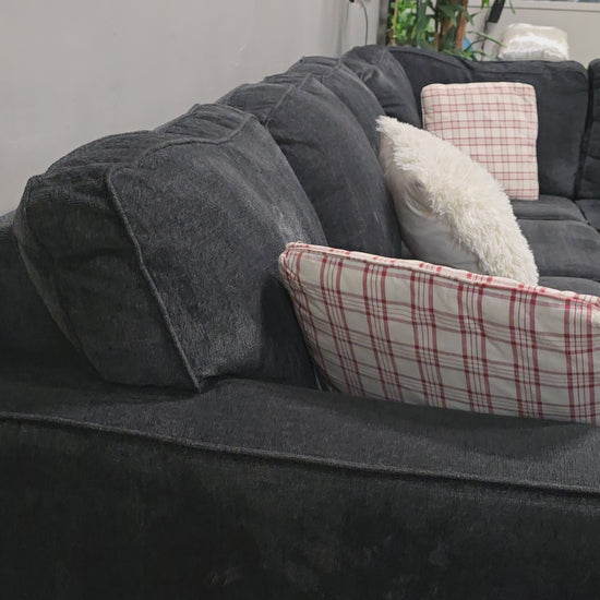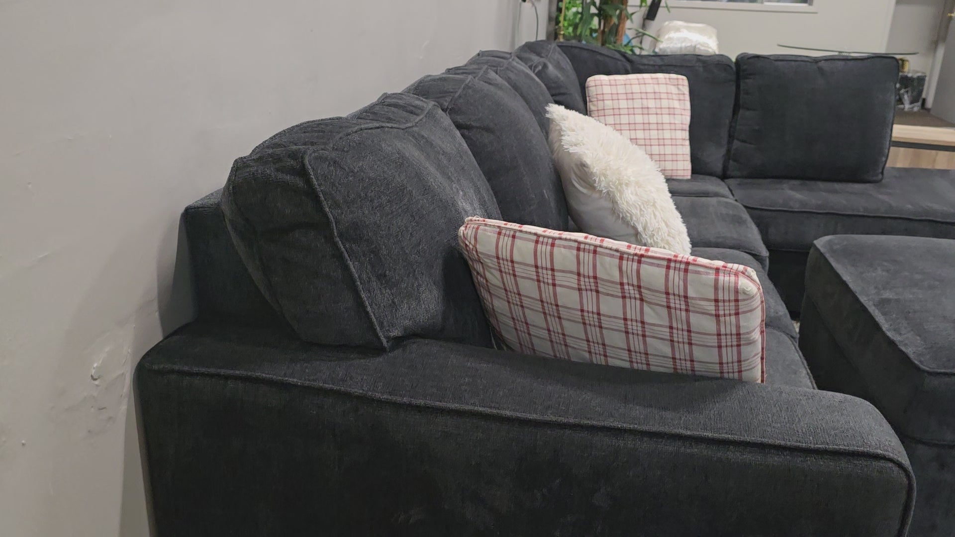 Spacious and stylish U-shape sectional designed for modern living. Deep seating and plush cushions create the perfect blend of comfort and design. Charcoal woven fabric is durable, pet-friendly, and easy to maintain. Two wide chaises and matching ottoman offer a versatile seating arrangement for family or guests.