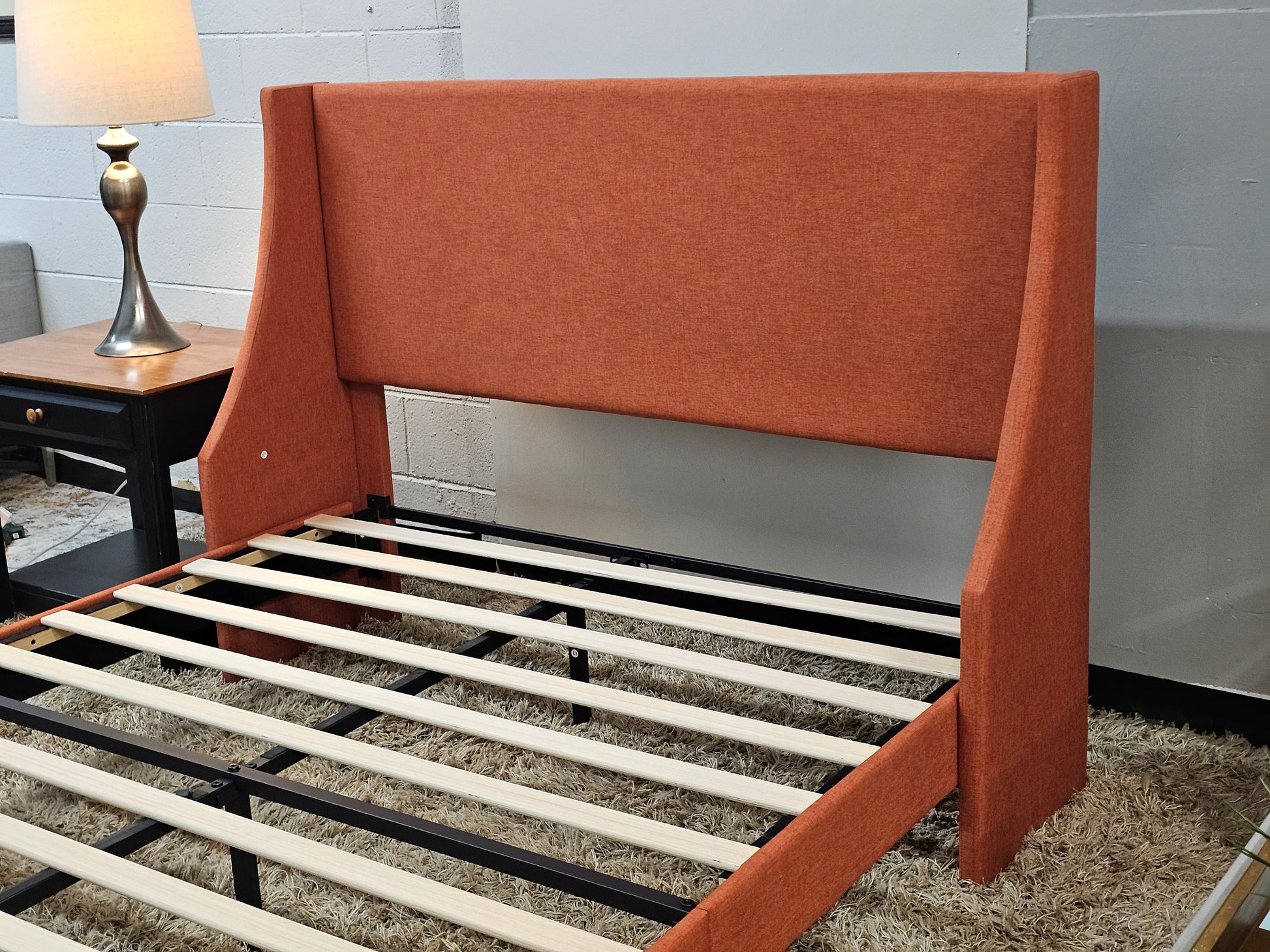 Add a bold touch of style to your bedroom with this modern upholstered bed frame. Wrapped in a rich burnt orange fabric, the clean lines and slightly winged headboard bring warmth and character to any space.