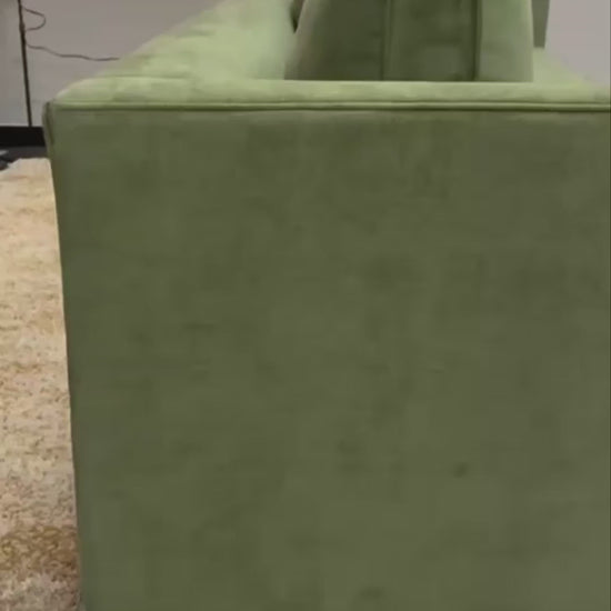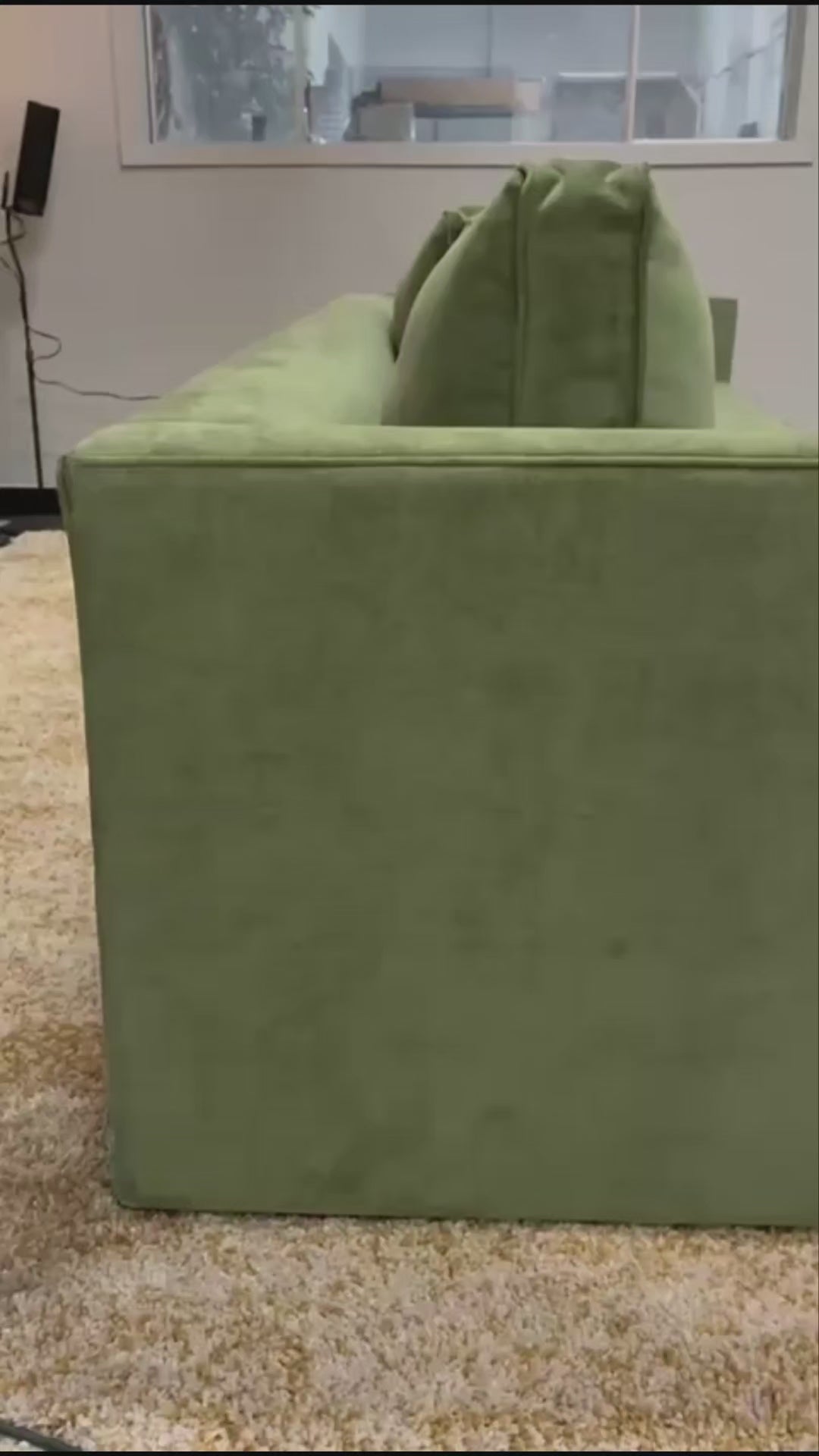 Bring home style and comfort with this spacious West Elm sofa, crafted in the USA and upholstered in a rich olive green fabric. Its clean, modern silhouette with box arms and deep cushions makes it a versatile centerpiece for any living room, loft, or office lounge.
